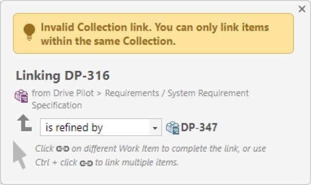 La collection vous permet également de relier des Work Items entre eux avec une validation des liens en temps réel, ce qui assure leur cohérence au sein même de la Collection. En d’autres termes vous ne pouvez lier les Work Items d’une même Collection que lors de l’ouverture du lien dans le contexte de la Collection.