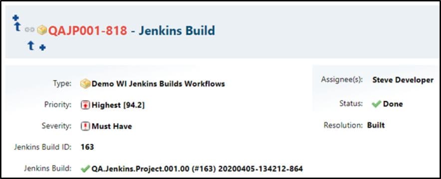 Lorsqu’un build Jenkins est exécuté depuis Polarion, il est ensuite monitoré via un polling Jenkins pour récupérer les données actualisées. Le numéro de Build et le statut du Build sont alors récupérés de Jenkins et stockés sur la page Build de l’onglet Builds de Polarion. Ces informations peuvent également être stockées dans des champs personnalisés de Work Items ou de Test Runs si le processus a été déclenché par une fonction Workflow, en incluant un lien vers le Build Polarion qui a été créé lorsque le build distant a été déclenché.