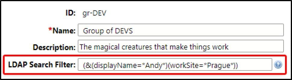 Chaque groupe d’utilisateurs peut être relié à LDAP via un filtre de recherche LDAP. Si ce champ optionnel dans les détails d’un groupe d’utilisateurs est vide, le groupe d’utilisateurs ne sera pas synchronisé avec LDAP. Si ce champ n’est pas vide, la synchronisation LDAP tentera de mettre à jour les utilisateurs du Groupe sur la base de la query LDAP saisie dans ce champ.
