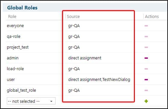 Parce que les rôles peuvent être attribués aux utilisateurs directement ou via un groupe d’utilisateurs, il est important de savoir comment l’affectation a été faite. Une nouvelle colonne Source a été ajoutée aux sections Global Roles et Project Roles de la page d’administration des utilisateurs, et à la section Utilisateurs de la page d’administration des rôles. Cette colonne indique à l’administrateur si un rôle a été directement attribué ou provient d’un ou plusieurs groupes d’utilisateurs (et répertorie alors tous les groupes d’utilisateurs).