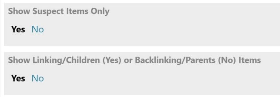 Astuce : Si vous choisissez No mais que vous désirez cependant identifier les liens suspects, choisissez l'option Collapse by default : No, le symbole suspect sera présenté dans le tableau même si vous n'affichez pas d'autres attributs.