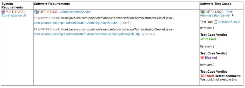 Sous Polarion, nous pouvons lier des Works Items (ex: exigences logicielles ) au code source qui les implémentent ( fonctionnalité Resource Traceability de Polarion ). C'est l'objectif de l'option Display Link to Resources qui liste ainsi dans la cellule les programmes liés, comme ci-dessous dans la colonne Software Requirements :