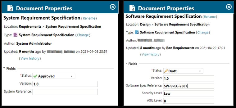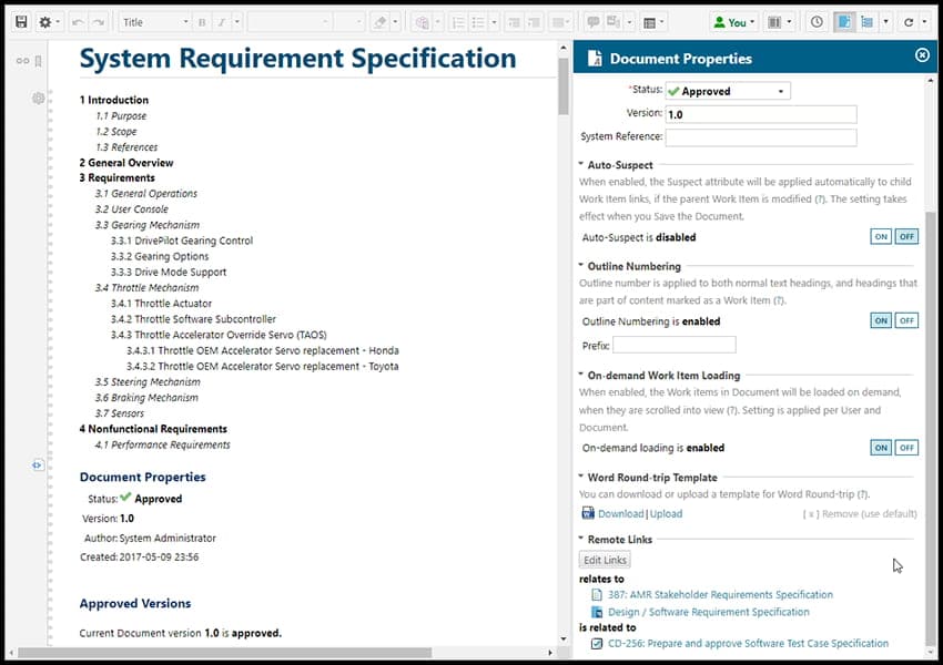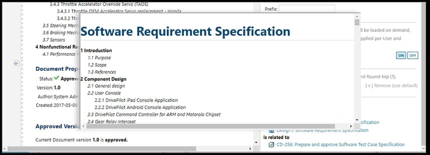 Champs personnalisés pour le type de document System Requirement Specification / Champs personnalisés pour le type de document Software Requirement Specification Conserver la sélection du Work Item dans le LiveDoc quand on bascule de la vue filtré à la vue standard d’édition En mode filtre, le LiveDoc est en lecture seule, seuls les attributs peuvent être modifiés. Il est d’usage d’activer le mode filtre pour faire une recherche, puis de revenir en mode édition. Désormais , vous conservez votre contexte de travail lorsque vous basculez entre le mode de lecture seule filtré et le mode d’édition complète d’un Live Doc, en restant sur le Work Item sélectionné en mode filtre. Navigation via les Work Items liés dans l’éditeur de document La présentation des liens des Work Items dans le layout du document a été unifiée avec le comportement existant dans la fenêtre Work Item Properties Sidebar.