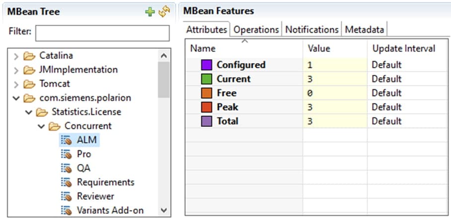 Administration des Personal Access Tokens Surveillance des licences via Java Management Extensions L’utilisation des licences Polarion peut désormais être facilement surveillée via les nouvelles statistiques de licence MBean qui exposent les informations d’utilisation des licences via l’API Java Management Extensions, ou JMX. Le JMX est une technologie Java standard qui permet de collecter facilement ces statistiques dans des outils de surveillance d’entreprise tels que Zabbix ou Kibana, ou permet d’afficher ces statistiques avec des outils tels que Java Management Console.