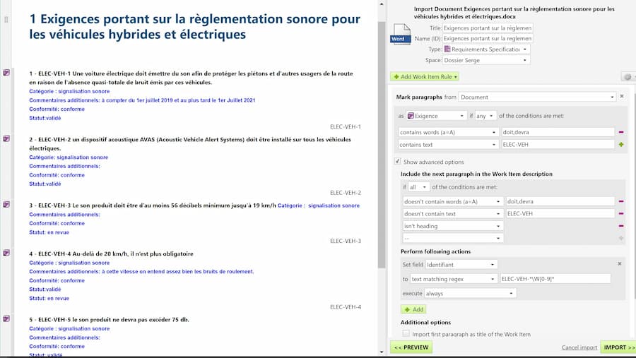 Polarion intégré dans l’espace de travail de Simulink Nous voulons aussi mettre dans la description de l'exigence tout le paragraphe qui suit la référence, jusqu'à ce qu'une nouvelle exigence débute ou que nous tombions sur un chapitre ( heading) . Pour réussir cet exercice, mettre la ou les règles inverses de celles utilisées pour la reconnaissance couvre généralement l'objectif. En mode Preview, à faire avant l’import effectif du document, voici ce que nous donne cette première configuration : chaque exigence est bien marquée en tant que Work Item.