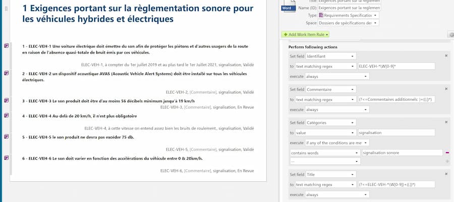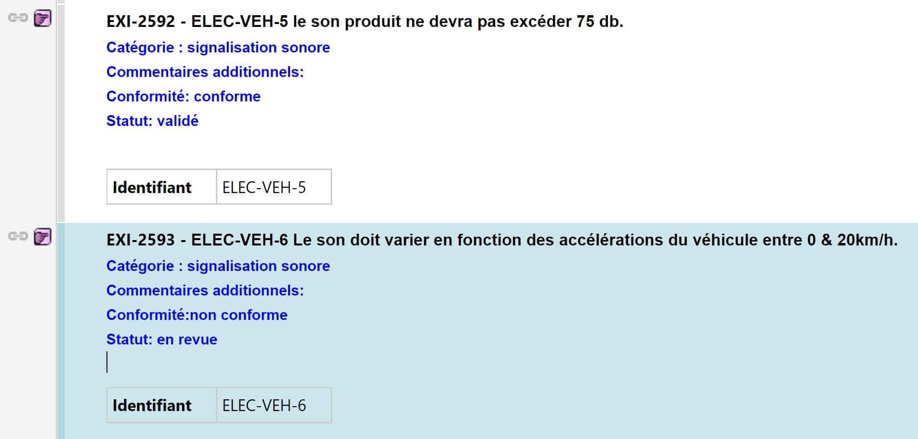 C'est une première étape, mais est-ce pleinement satisfaisant quand nous basculons sous Polarion ALM, où nous voulons pouvoir filtrer et effectuer des recherches sur des attributs et non pas chercher du texte dans un document. Première étape que nous illustrons ci-dessus, la capture de l'identifiant de l'exigence dans un champ dédié. Ceci s'effectue par une expression régulière qui est dans notre exemple : ELEC-VEH-*W[0-9]*. Nous ne ferons pas ici un cours sur la mise en forme d'une expression régulière mais juste un conseil : testez vos expressions à l'extérieur de Polarion puis une fois validée copiez/collez l'expression dans le champ Polarion dédié ; un site comme www.regex101.com couvre bien le besoin. Voici le résultat après import sur deux exigences : notez que le contenu du champ Identifiant est présenté dans le document derrière l'exigence, nous vous montrerons comment l'afficher ainsi.