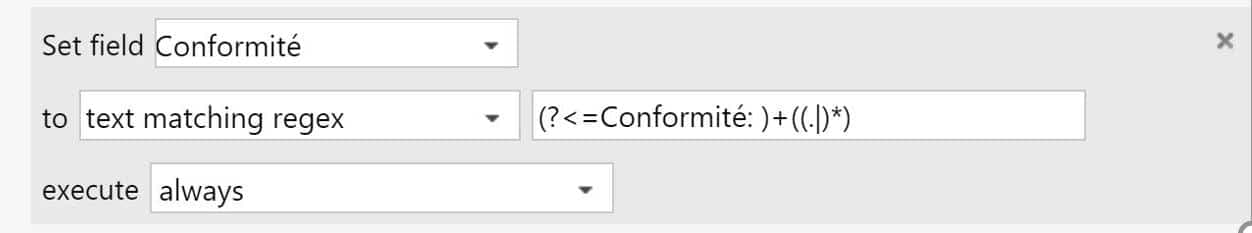 - une expression régulière comme pour les champs Conformité et Commentaires Additionnels. Sans la décrire, cette expression (?<=Conformité: )+((.|)*) permet de trouver le texte demandé et de prendre en compte l'ensemble du texte jusqu'au prochain saut de ligne.
