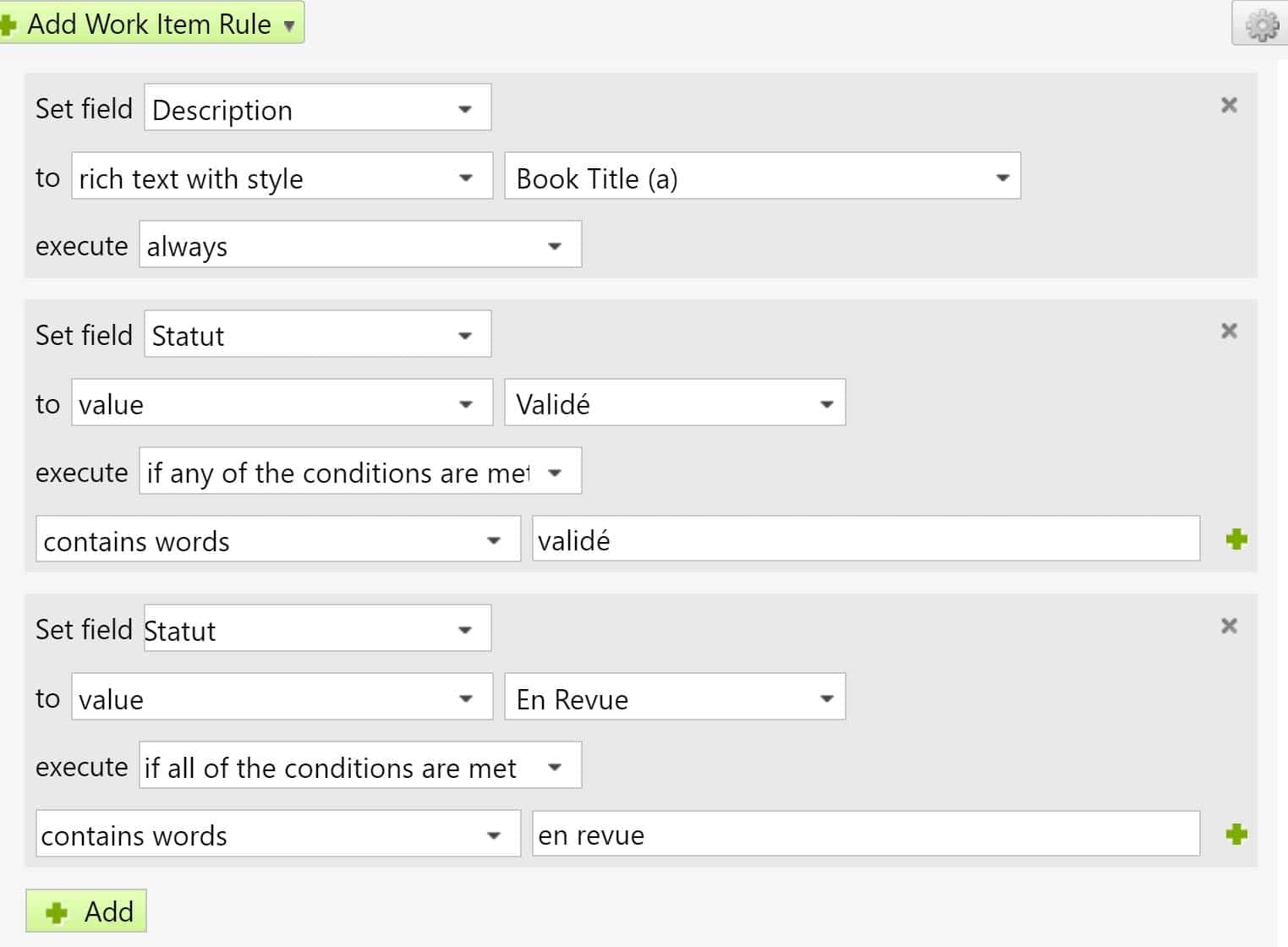 - une reconnaissance par mots contenus, pour les champs de type énumérations comme le champ Statut