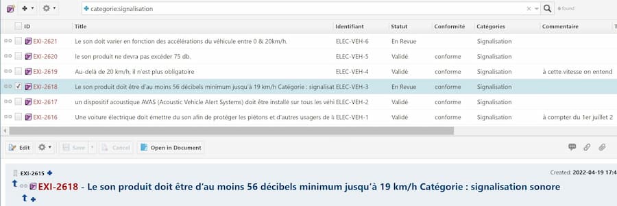 En vue table, nous retrouvons nos exigences avec leurs attributs exploitables pour la recherche ou pour délivrer des indicateurs. Nous voyons aussi que l'identifiant de l'exigence a été enlevé du titre puisque nous avons créé un champ dédié.