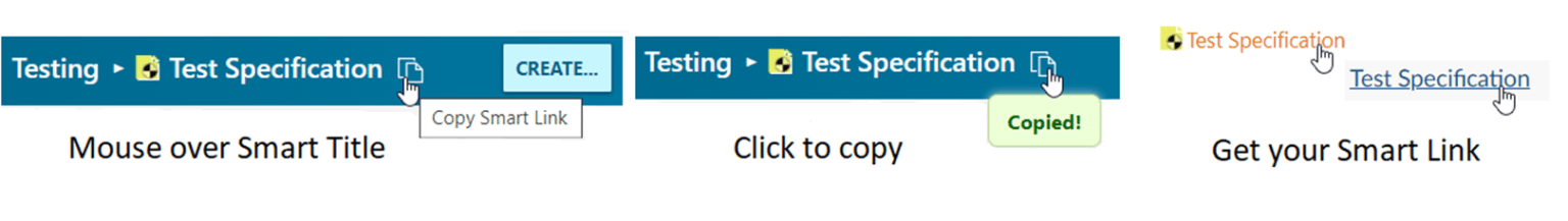 - Cliquer sur l’icône qui apparaît au passage de la souris à côté du Smart Title vous permet d’obtenir et copier le lien vers l’artefact Polarion concerné. Le lien peut être utilisé sous Polarion et dans toute autre application externe (Microsoft Teams, Microsoft Outlook, Slack, etc.) pour référencer facilement les artefacts Polarion,