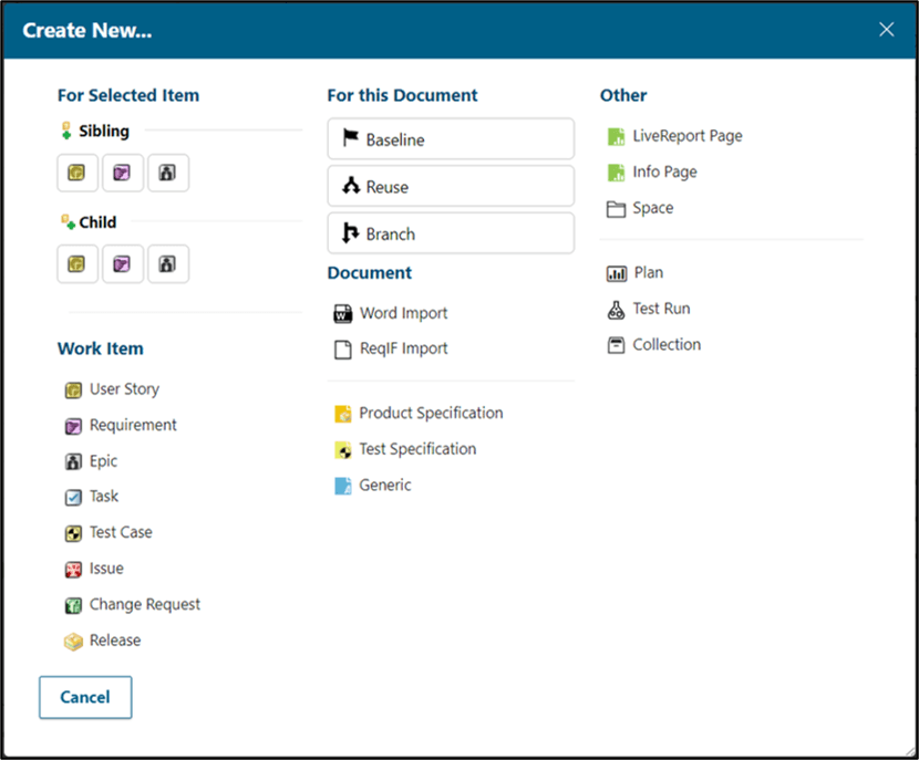 La boîte de dialogue Quick Create est conçue pour guider l’ utilisateur dans la création d’artefacts, quelle que soit la vue spécifique dans laquelle il se trouve. Les fonctions accessibles via la fenêtre Quick Create prennent désormais en compte le contexte et l’espace de travail courant de l’utilisateur, permettant ainsi de réaliser des actions sur les Work Items ou documents actifs. Le contenu Quick Create dans Polarion peut être personnalisé avec du code Velocity en tenant en compte du contexte de l’utilisateur, afin d’étendre l’adaptation de la page à différents scénarios. Les références à tous les artefacts Polarion (Project, Space, Document, Rich Page, Plan, Test Run, Work Item) peuvent être exploitées et présentées via Velocity. La configuration par défaut de la fenêtre Quick Create est fournie pour servir de base départ à des personnalisations plus poussées, elle peut être téléchargée à partir de l’aide de Polarion .