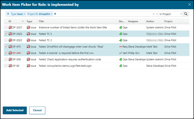 Lier en masse des Work Items existants La version précédente de Polarion a apporté de nouvelles fonctions de création de liens entre Work Items existants en utilisant les Form Menus, cette version offre de nouvelles fonctionnalités facilitant et améliorant ces opérations. Un nouvel attribut « projectQuery » dans la configuration des Form Menus, combiné avec les attributs « role » et « type », permet d’afficher la liste de projets où se trouvent les Work Items vers lesquels on désire établir un lien. Ceci permet à un utilisateur de lier aisément des Work Items d’un type spécifique à partir d’un projet spécifique par un rôle spécifique. La sélection multiple est désormais disponible dans le Work Items picker, ce qui a permis de lier en bloc plusieurs Work Items existants. Afin que l’utilisateur puisse facilement s’assurer du type de lien qui est utilisé, le label du rôle est désormais affiché dans le titre de la fenêtre.