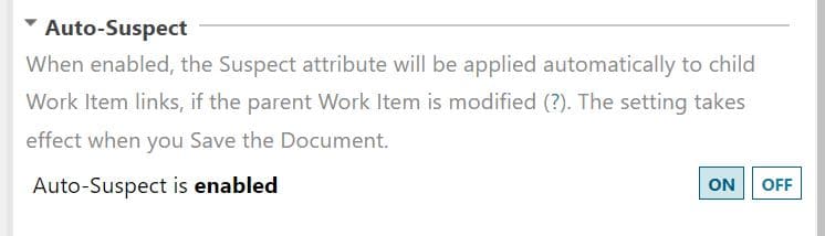 - Seconde option : La propagation d’impact est automatique ! Tout changement au niveau d’un Work Item parent, contenu dans un LiveDoc qui a l’option Auto suspect=On , déclenchera un lien suspect vers les Work Items qui sont liés. Nous pouvons envisager par exemple ce cas d’utilisation : le document de spécifications d’exigences réglementaires a été validé dans sa version 2020-2, une nouvelle réglementation 2023-3 nous conduit à faire évoluer certaines de ses exigences. Puisque le document a basculé en auto-suspect suite à sa validation dans sa précédente version, toutes les exigences systèmes rattachées aux exigences réglementaires modifiées passeront suspectes. Un avantage certain : il n’y a pas de risque d’omission de propagation d’impact. Autre facilité : activer l’auto suspect du document sur la transition du workflow vers l’état final du document peut aisément se faire par un script de workflow.