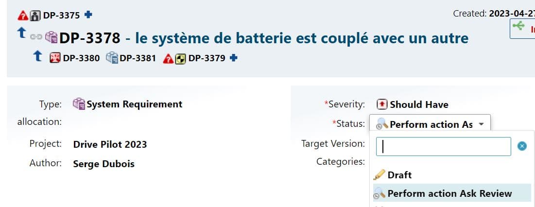 Ainsi les autres acteurs du projet peuvent avoir un tableau de bord des demandes de changements récentes, trouver les exigences impactantes pour leurs propres systèmes ou essais, et en suivant les liens couvrir l’analyse d’impact. Regardons maintenant le principe de lien suspect Il s’agit ici d’utiliser les liens pour encore mieux déclarer des éléments suspects, potentiellement impactés par les changements. Si dans la réalité c’est le lien qui passe suspect, nous dirons pour simplification que c’est le Work Item (l’exigence, le test, le risque…) qui devient suspect.