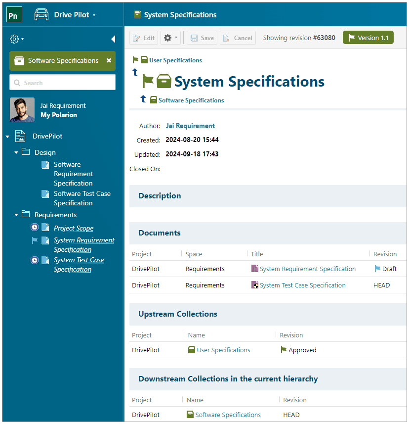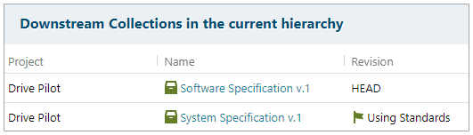 Ceci est important dans le développement de systèmes complexes, où les équipes travaillent avec un grand nombre de documents en parallèle. Chaque Collection peut alors représenter un regroupement de nombreux documents à un niveau particulier du modèle en V par exemple. À mesure que les documents de niveau inférieur sont développés, ils dépendent des documents de référence en amont représentés dans leur propre Collection. Avec les hiérarchies de Collections, vous pouvez garantir que les liens entre les Work Items à travers les Collections sont créés au bon point de révision. Les hiérarchies de Collections aident également si la Collection dépendante en amont doit un jour être remplacée par une Baseline différente en raison d'un changement de conception. Polarion prend alors en charge tout le travail pour relier automatiquement les Work Items existants aux nouvelles révisions. Le nouveau formulaire de Collection présente désormais les relations en aval avec les Collections dépendantes de niveau inférieur.