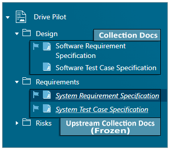 Les Collections sont présentes sous Polarion depuis la Polarion 20 R1. Elles vous permettent de regrouper des documents se trouvant dans des Baselines ou états de révision spécifiques. Vous pouvez consulter, travailler sur les documents contenus dans la Collection, une Collection peut être gérée en Baseline. Les Collections vous aident à lier les Work Items des documents se trouvant dans des révisions ou Baselines différentes. Cette capacité est essentielle dans le développement parallèle lorsque qu'un document en amont a déjà évolué vers une révision ultérieure. Cela permet au document en aval de créer et de maintenir des liens vers l'ancien point de révision. La nouvelle capacité de hiérarchie de Collections introduite dans Polarion 2410 étend davantage ce concept. Désormais, vous pouvez créer une relation spéciale entre les Collections, où une Collection de niveau inférieur dépend d'une Collection de référence en amont. Cela permet d'établir des liens entre des Work Items non seulement entre les documents d'une seule Collection, mais aussi entre les Work Items à travers des Collections connexes.