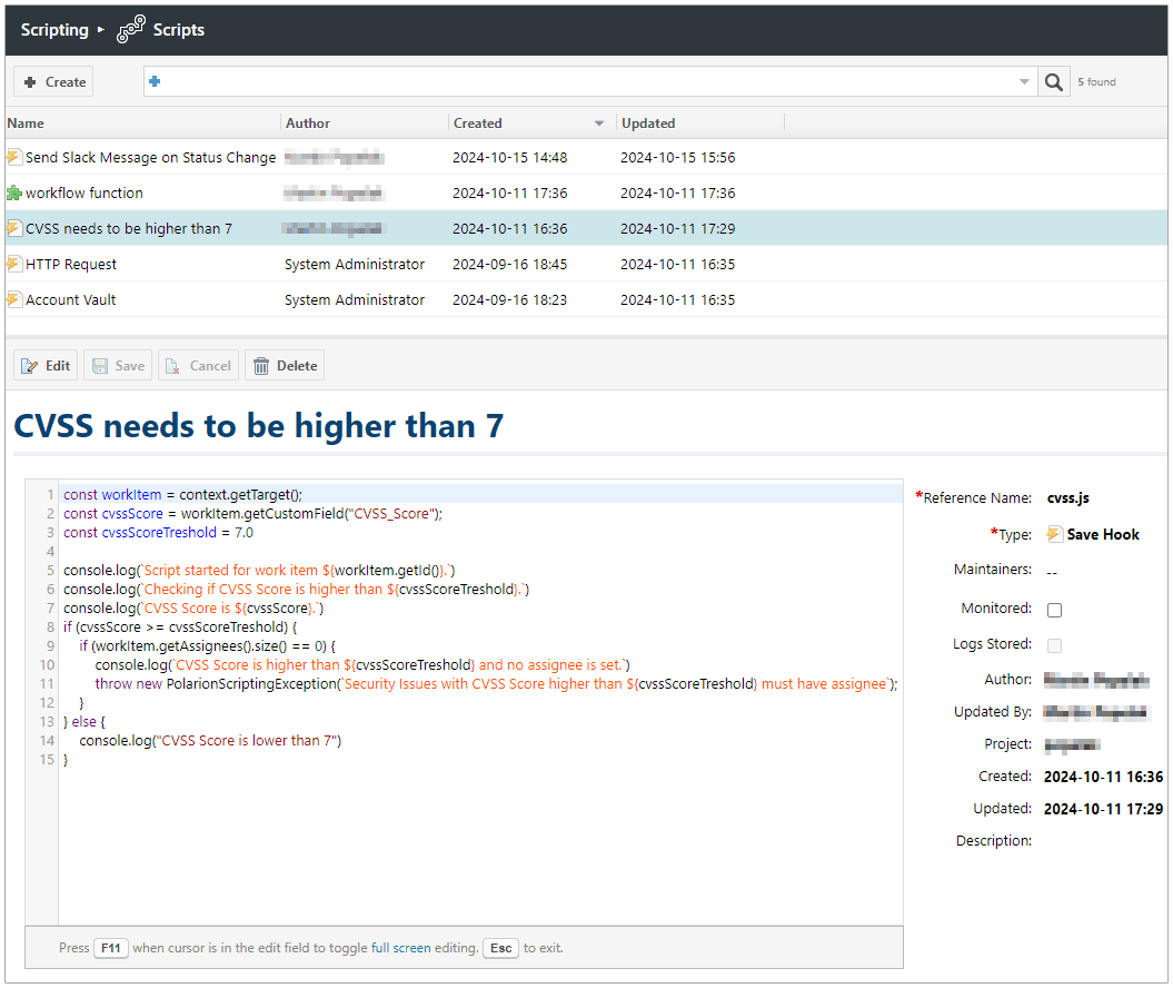 Des scripts sont souvent employés pour automatiser des tâches liées au processus métier ou répétitives, ces scripts devaient être placés sur le serveur physique, et nécessitaient pour les Save Hook l’installation d’une extension complémentaire. Polarion Scripting permet désormais d’écrire des scripts directement à partir de l'interface d'administration de Polarion et surveiller leur exécution via le nouveau moniteur de script.