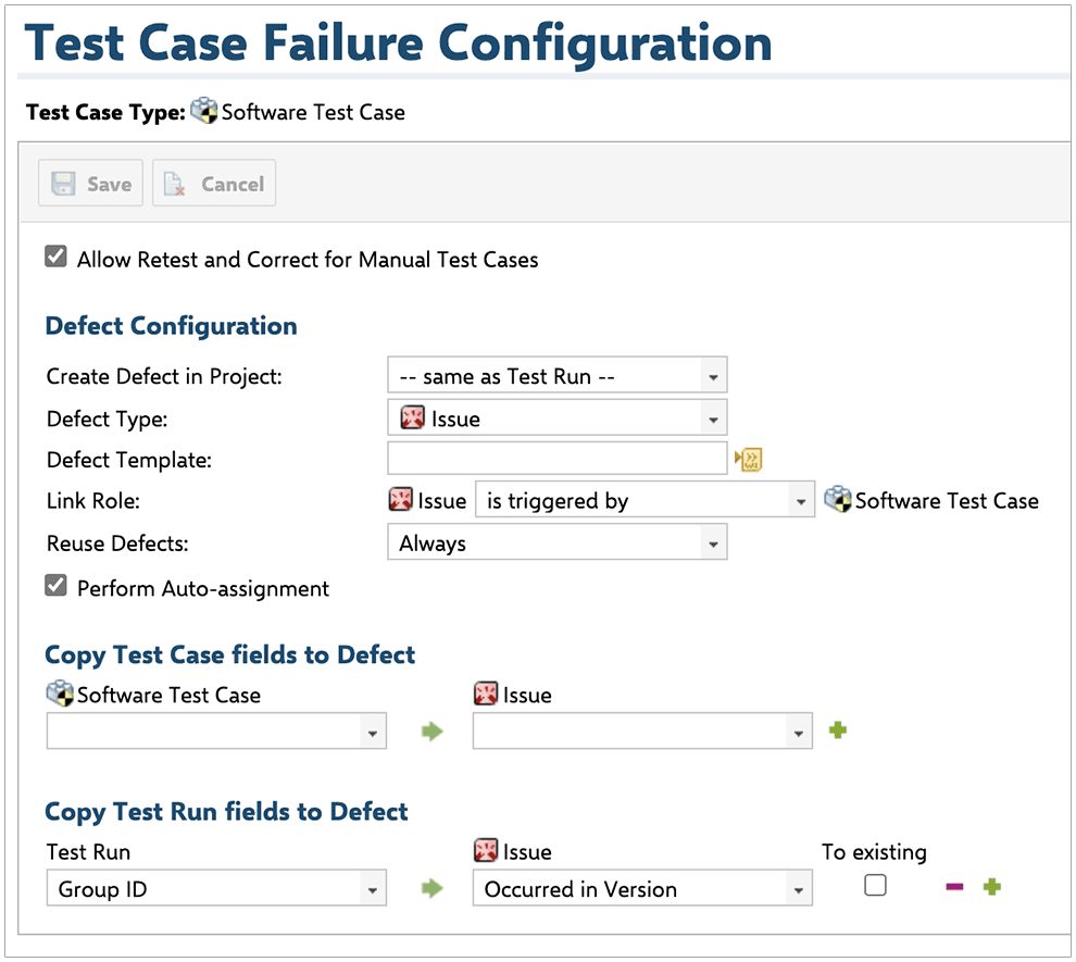 Vous pouvez créer des configurations propres aux différents types de défauts créés suite à un échec, vous offrant ainsi une plus grande flexibilité et un meilleur contrôle de votre gestion des tests et défauts associés.