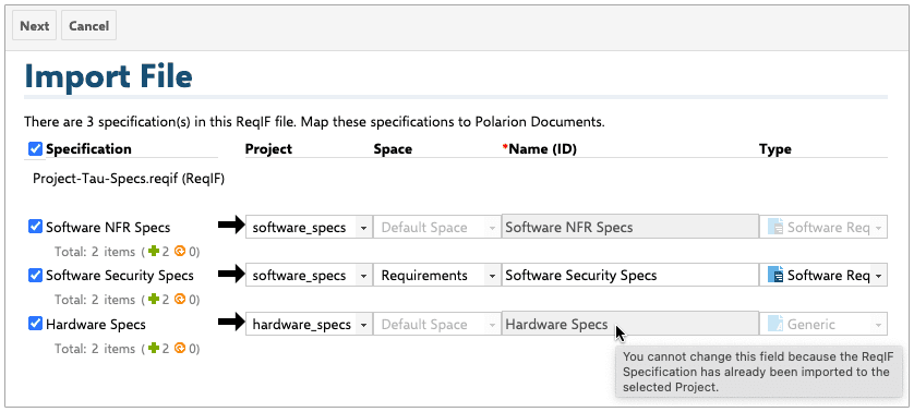 Distribution des documents ReqIF vers différents projets en une seule fois Les fichiers ReqIF peuvent contenir plusieurs documents, tels que des spécifications matérielles et logicielles. Dans l'assistant d'import du ReqIF, vous pouvez désormais sélectionner un projet cible par document ReqIF. Polarion importera les documents vers les projets cibles sélectionnés. Si des liens existent dans le document ReqIF, Polarion créera les liens entre les projets cibles.
