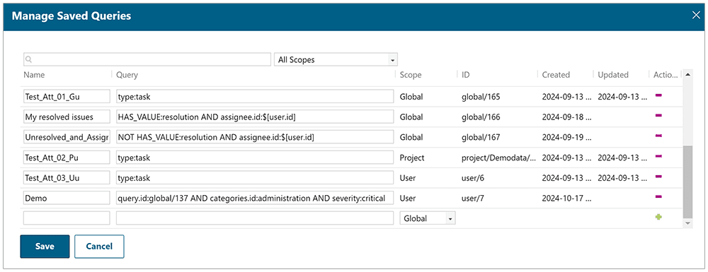 Vous pouvez également directement mettre à jour les requêtes enregistrées existantes dans la boîte de dialogue de gestion des requêtes. Des filtres permettent de faciliter la gestion pour les administrateurs de projet et globaux. Les attributs suivants ont été ajoutés aux requêtes enregistrées :