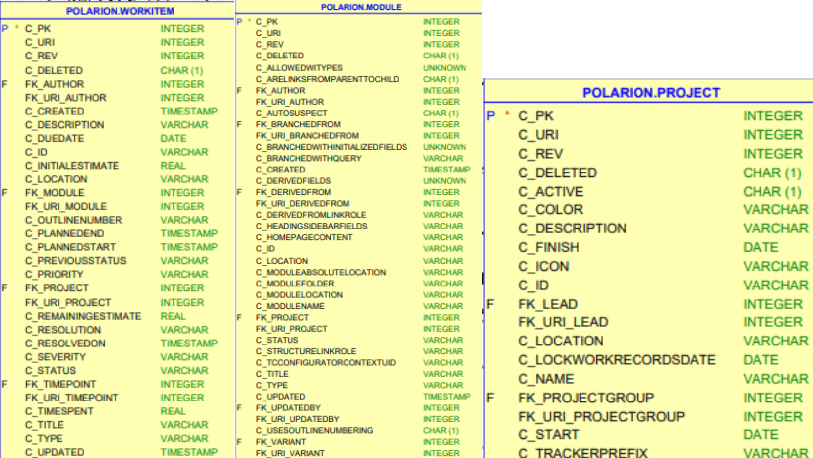 Pour rechercher des données dans cette base, on utilise une requête Select : sans doute n’avez-vous pas appris SQL en deuxième langue, aussi faisons-nous en sorte de générer la requête à partir d’une page et la rendre la plus transparente possible pour les utilisateurs finaux, l’essentiel étant qu’elle retourne les objets désirés ! Polarion s’appuie donc également sur une autre base de données : PostgreSQL, base qui est en réalité un miroir des données gérées sous Subversion, qui reste le référentiel de Polarion. Il n’est donc pas nécessaire de faire des backups de cette base PostgreSQL car elle est régulièrement rafraichit à partir de Subversion, et il n’y a pas de possibilité de mise à jour des données via cette base de données. Quand on regarde la documentation de Polarion, on trouve cette page : https://testdrive.polarion.com/polarion/sdk/doc/database/FullDBSchema.pdf , qui donne le schéma de toute la base de données, il faut zoomer ! On y trouve les tables des objets bien connus que sont par exemple les Work Items et les LiveDocs, table nommée ici module. Pour chacune des tables, nous pouvons voir par exemple les colonnes de la table Work Item, ou l’on retrouve le statut ( C_Status) ou encore le titre ( C_Title )