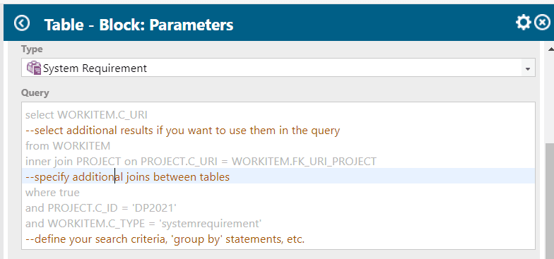 Nous n’en dirons pas plus à ce stade sur les jointures. Retenons que sous Polarion, par du SQL on peut effectuer des requêtes simples ou complexes sur les données, principalement pour faire des requêtes de traçabilité. Cependant en dehors de ce cas nous utilisons plutôt les requêtes classiques de l’assistant, plus simple, project.id :drivepilot AND type :systemrequirement qui nous donnera le même résultat.