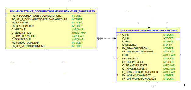 C’est ici que je reviens sur les 2 bases de Polarion ; nous avons la base Polarion qui contient les données dans leur version courante et la base Polarion_History, qui contient les mèmes données courantes plus les données historiques (révisions) ; nous devons obligatoirement utiliser cette base pour trouver nos signatures historiques. La requête exploitera la table des LiveDocs ( module ), la table des signatures ( DocumentWorkflowSignature) et une table de correspondance faisant le lien entre les signatures et les documents ( struct_documentworkflowsignature_signatures)
