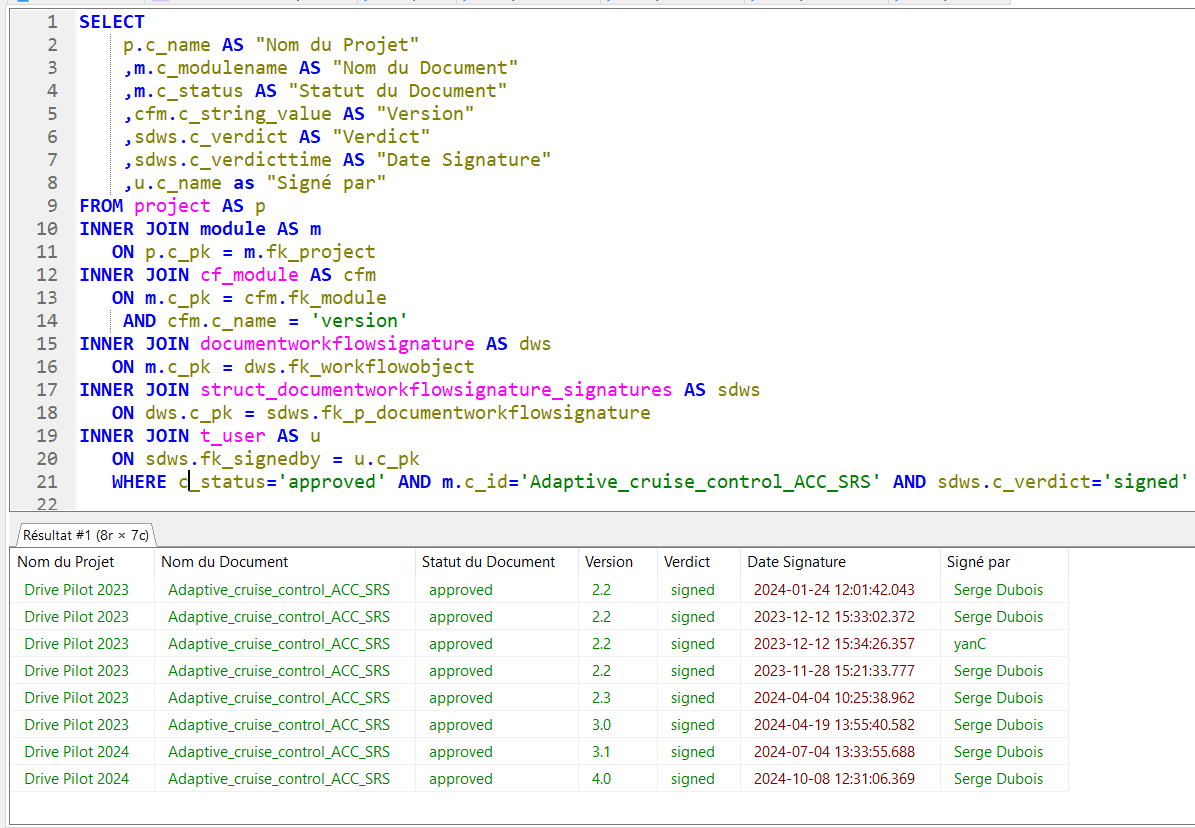 - SELECT p.c_name AS "Nom du Projet" ,m.c_modulename AS "Nom du Document" ,m.c_status AS "Statut du Document" ,cfm.c_string_value AS "Version" ,sdws.c_verdict AS "Verdict" ,sdws.c_verdicttime AS "Date Signature" ,u.c_name as "Signé par" FROM project AS pINNER JOIN module AS m ON p.c_pk = m.fk_projectINNER JOIN cf_module AS cfm ON m.c_pk = cfm.fk_module AND cfm.c_name = 'version'INNER JOIN documentworkflowsignature AS dws ON m.c_pk = dws.fk_workflowobjectINNER JOIN struct_documentworkflowsignature_signatures AS sdws ON dws.c_pk = sdws.fk_p_documentworkflowsignature INNER JOIN t_user AS u ON sdws.fk_signedby = u.c_pk WHERE c_status='approved' AND m.c_id='Adaptive_cruise_control_ACC_SRS' AND sdws.c_verdict='signed'