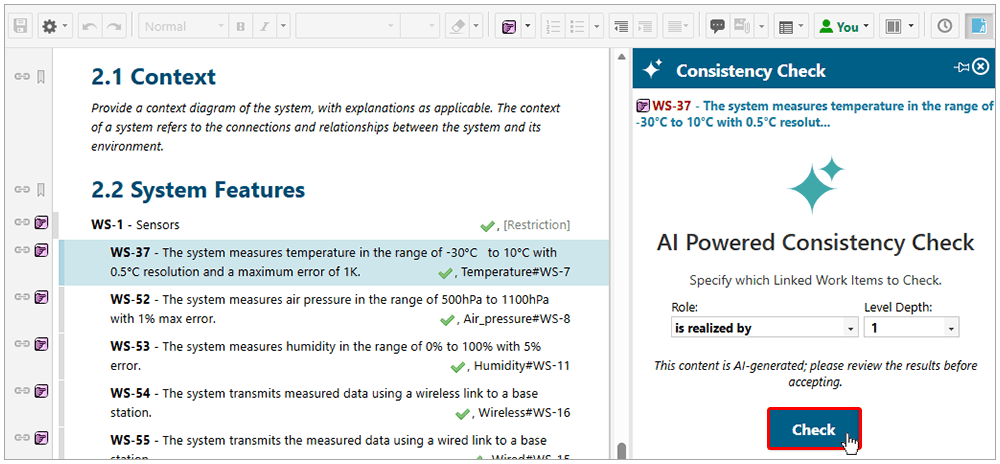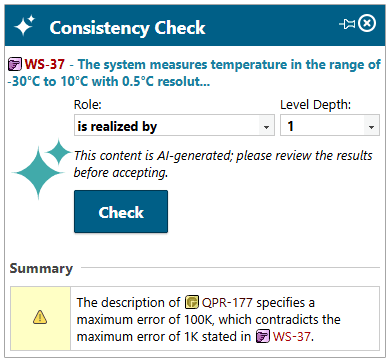 Pour un Work Item donné, la fonction Consistency Check parcourt tous les Work Items liés (par exemple des exigences vérifiées par des tests), pour un type de lien et une profondeur désirée et détecte toute incohérence ou contradictions, notamment dans leurs descriptions.