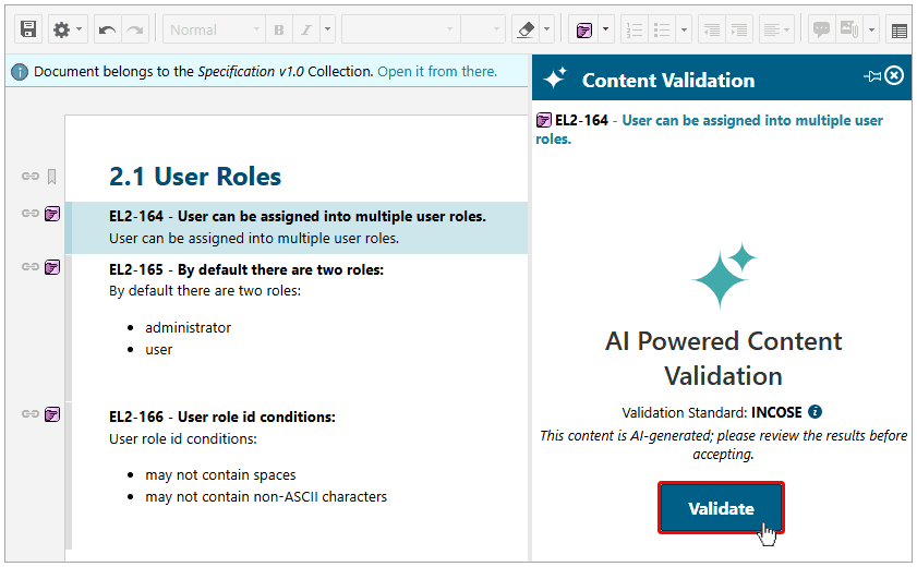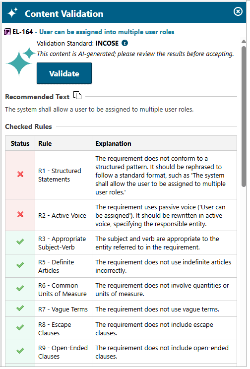 La fonction Content Validation permet de comparer directement les descriptions des exigences que vous avez rédigez aux normes rigoureuses publiées par l' INCOSE (International Council on Systems Engineering).