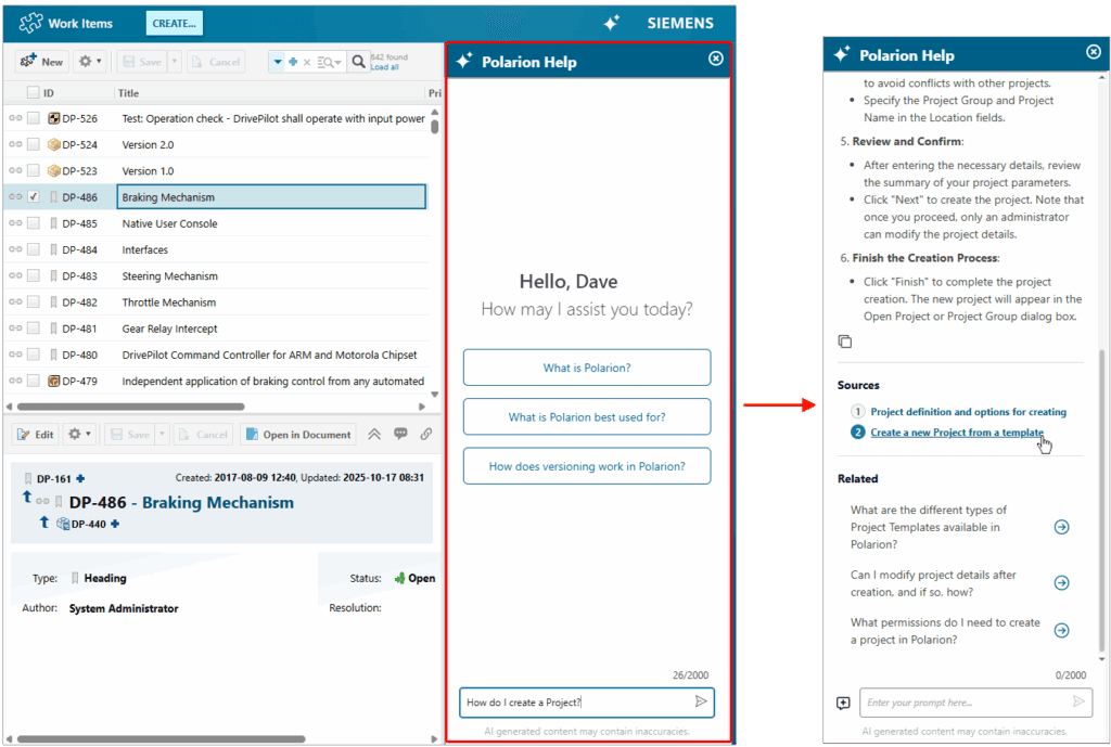 Dernière évolution sur le thème de l’IA, vous disposez désormais d’un chatbot d'aide en ligne Polarion s’appuyant sur de l’IA. Cet assistant est accessible à partir de n'importe quelle section de Polarion. Au lieu de parcourir la documentation d’aide, posez-lui toutes vos questions pour obtenir rapidement une réponse rapide, claire et concise.