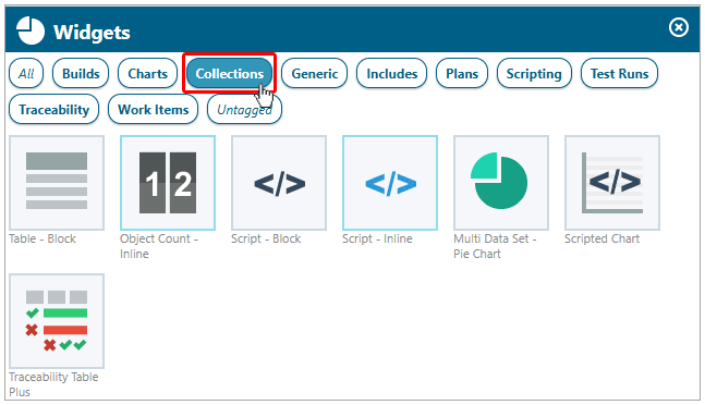 Une nouvelle catégorie de widgets nommée « Collections » regroupe les composants graphiques pouvant être utilisés dans le cadre d’une Collection, ceci permettant d’aller au-delà de la Scripting ajoutée préalablement avec la version précédente Polarion 2506.