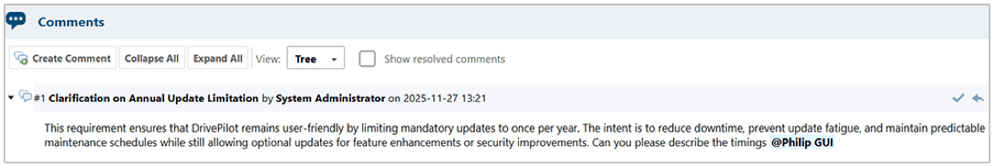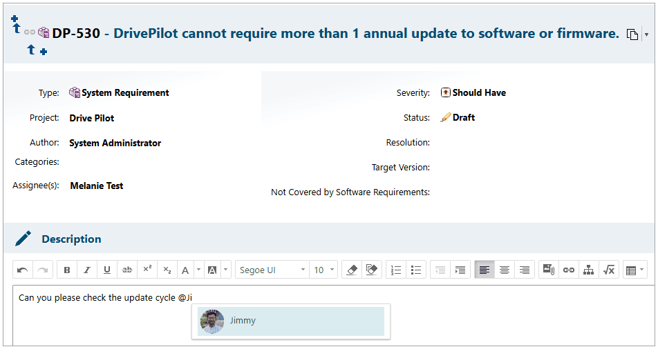En saisissant désormais un @ dans les commentaires d’un Work Item, d’un document ou d’une page, une fenêtre contextuelle s'affiche avec une liste configurable d'utilisateurs du projet permettant de cibler une ou plusieurs personnes destinatrices de ce commentaire. Le champ commentaires en profite pour devenir un champ riche-texte, ce qui permet une mise en forme plus claire du texte saisi. Par exemple le copier/coller d’hyperlien dans le champ commentaire est supporté.
