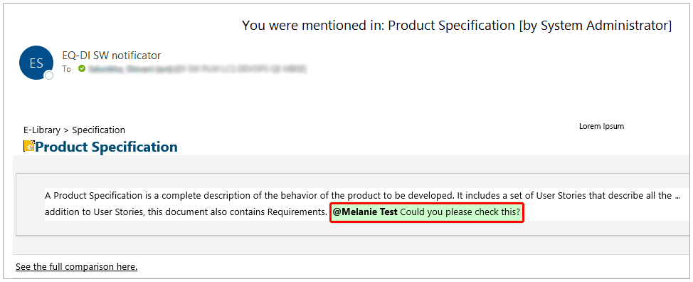Quand une ou plusieurs personnes sont désignées par une Mention, elles reçoivent un e-mail reprenant cette information leur permettant en un clic de naviguer vers l’élément concerné sous Polarion (il faut bien sûr que le serveur soit configuré pour permettre l’envoi et la réception d’e-mails, ainsi que les notifications)