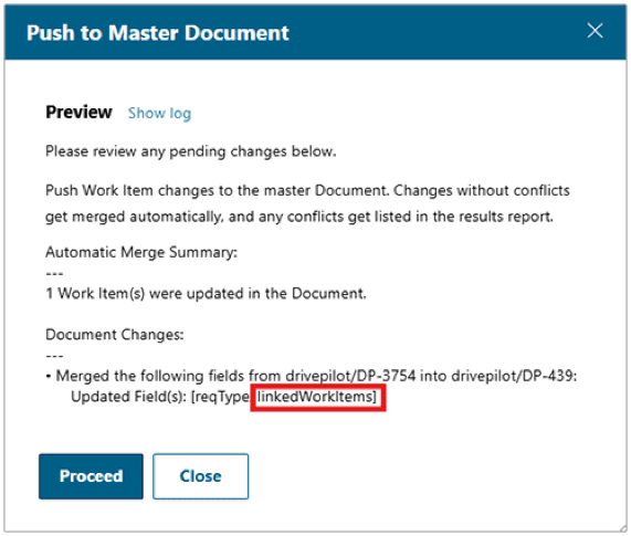 Que vous utilisiez la fusion manuelle ou automatique entre le document Master et ses branches, vous bénéficierez désormais de la fusion des liens entre Work Items. Ceci permet de prendre en compte l’ajout, la mise à jour ou la suppression de liens, que ce soit des liens vers des Work Items au sein du document fusionné ou dans d’autres documents.