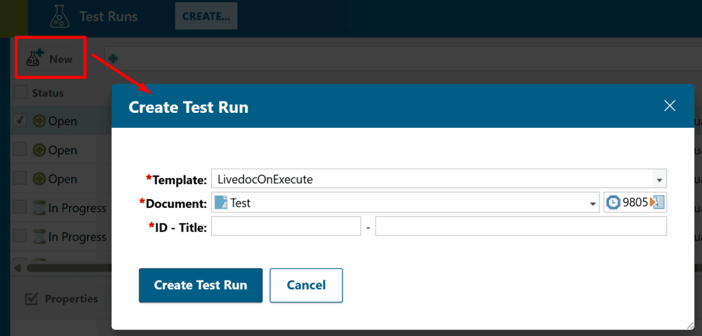 Un Test Run peut désormais être généré en sélectionnant une révision donnée ou une baseline d’un document, ce qui supprime le besoin de créer des Test Run Templates pour cibler une version donnée d’un document. Les deux approches ‘From LiveDoc on Create‘ et ‘From LiveDoc on Execute‘ sont supportées.