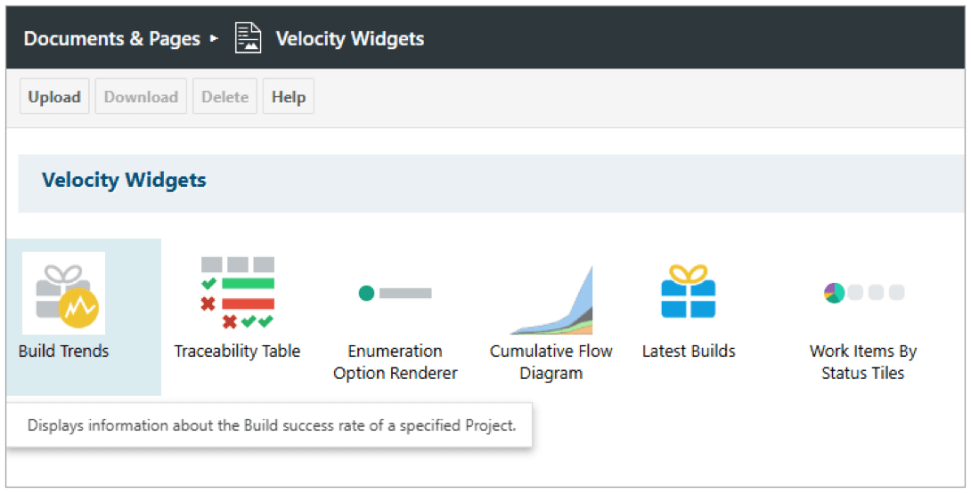 Pour gérer les widgets Velocity au niveau global ou projets, l'interface de Polarion se dote d’une nouvelle fonctionnalité d’administration de ces widgets, ce qui élimine le besoin d'outils externes comme TortoiseSvn pour télécharger en une seule opération tous les fichiers propres au widget.