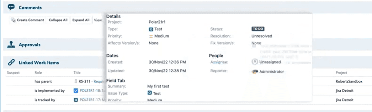 - Une autre approche est de s’appuyer sur une intégration tierce basée sur OSLC comme par exemple : https://extensions.polarion.com/extensions/359-oslc-connect-for-jira , celle-ci permet cette fois d’établir des liens de traçabilité entre objets Polarion et objets Jira, sans propagation des données d’un environnement à l’autre. Grace à la technologie OSLC, ce type d’intégration permet également de présenter au sein de chaque outil une prévisualisation des artefacts liés, sans besoin de naviguer d’un outil à l’autre.