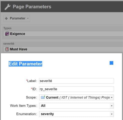 C’est généralement ici que la question se pose, car le paramètre doit être fourni différemment suivant si il est utilisé dans une requête lucene, ou dans une requête SQL par exemple : Restons simple pour ce premier exemple, le format est le suivant et est toujours le même ! : Il faut remplacer les valeurs par la formule suivante : $pageParameters.IdentifiantParamêtre.toLucene ( ou .toSql) Ainsi, cette approche permet de s’affranchir de comment le paramètre sera utilisé. Par exemple, toLucene retournera « ( Besoin Exigence) « alors que toSQL retournera « (‘Besoin’,’Exigence’) » : Notez les simple quotes requises par la requête SQL.