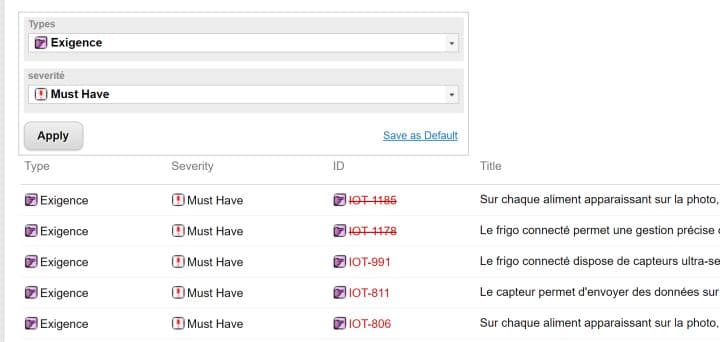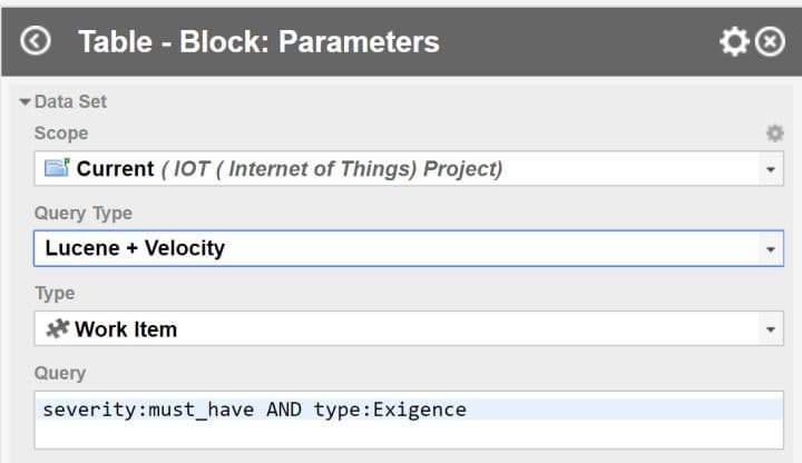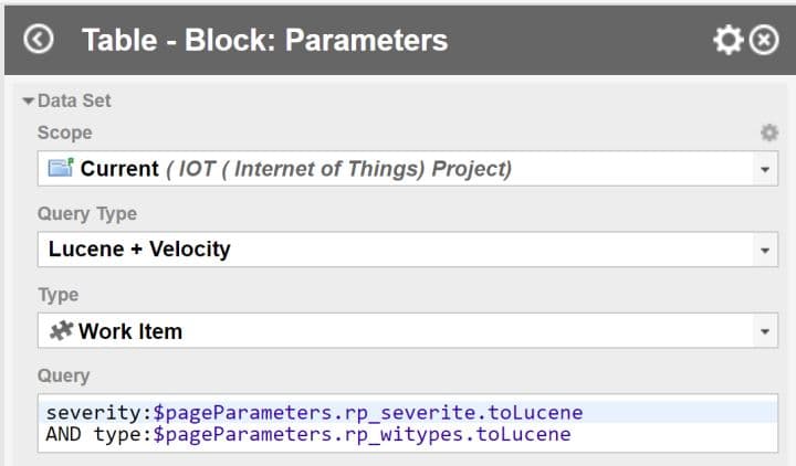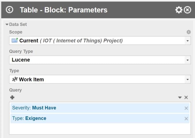 Un widget table avec les données fixées se présente ainsi, le Query Type est Lucene et dans Query , nous avons Severity : Must have et Type : Exigence Système. Il convient de remplacer ces valeurs par nos paramètres.