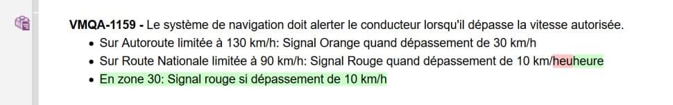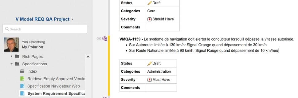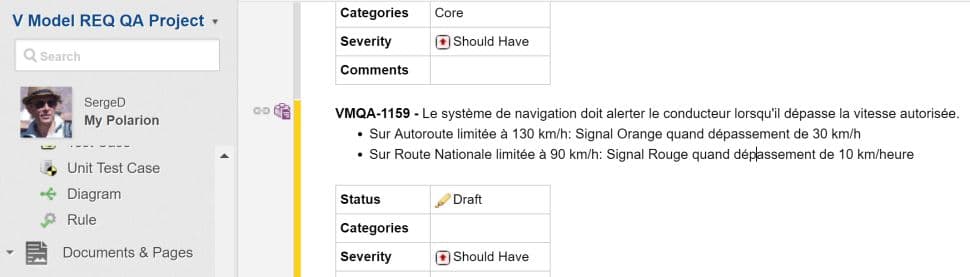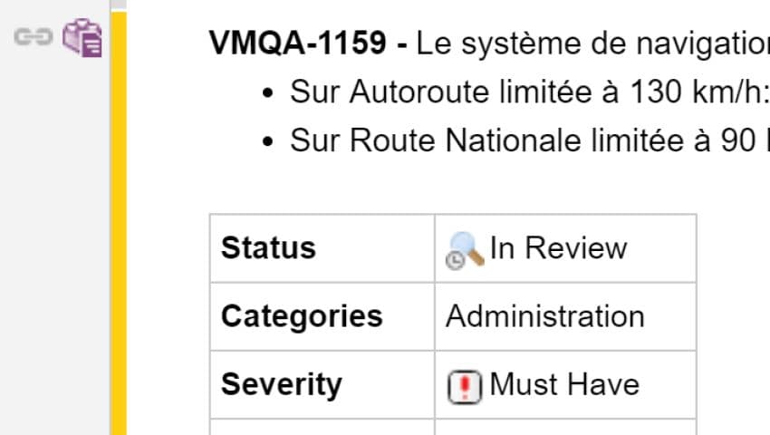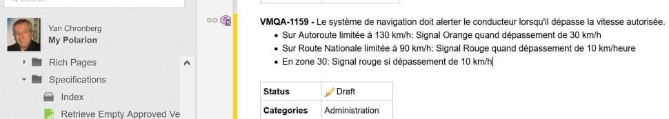 Dans cet exemple, Serge a créé une exigence dans un document de spécification relative à des alertes d’un système de navigation.