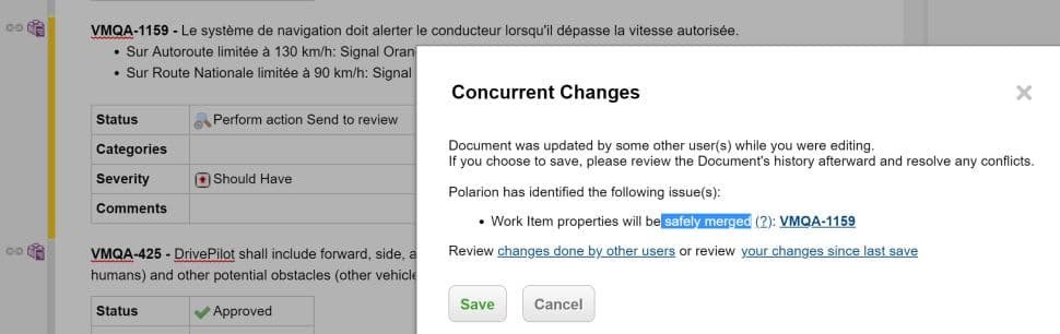Serge veut changer le statut de l’exigence de Draft à In Review : Polarion lui affiche alors une fenêtre de notification pour l’informer qu’une modification a été réalisée depuis l’ouverture du document mais que cette modification sera safely merged ! Il convient ici de faire attention au contenu du message.