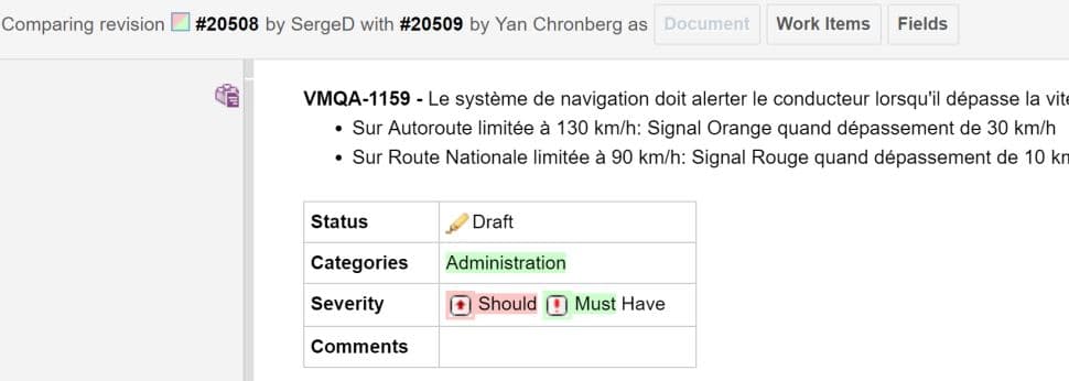 Après le Save fait par Serge, l’exigence passera ainsi dans l’état In Review en conservant les attributs catégories et sévérité fixés par Yan. La fusion des changements a été effectuée dans les règles de l’art.