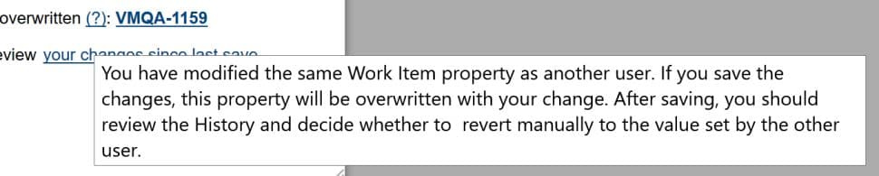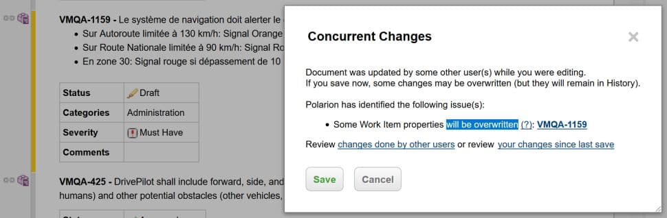 Il reçoit alors un message lui notifiant que « some Work Item properties will be overwritten ». Dans ce cas, Polarion ne peut pas fusionner les changements portant sur le même champ Description.
