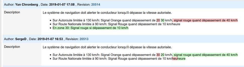 Si malgré le message, Yan effectue le changement, c’est son contenu qui vient alimenter l’exigence. Il doit alors avoir le réflexe d’afficher l’historique pour, si nécessaire, récupérer et réappliquer les changements réalisés préalablement par Serge.