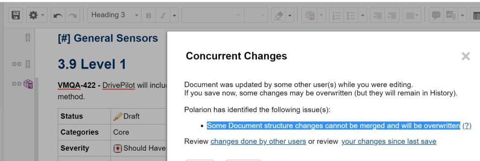 Dernier cas de conflit potentiel, la modification de texte libre ou de structure du document. A nouveau, Polarion peut suivant les cas n’avoir aucune difficulté à gérer la fusion des changements, ou aussi détecter un conflit