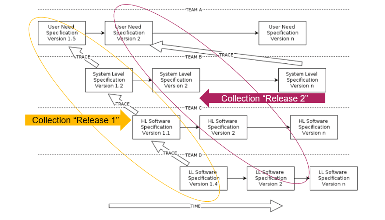Considérons des LiveDocs de Polarion contenant ou référençant des artefacts (Work Items exigences, tests, etc.) à différents niveaux de leur cycle de développement, par exemple l'ensemble des documents de spécification pour la version 1 d'un système. Quand l'équipe système a terminé la version V1 de sa spécification, elle veut partager exclusivement cette version avec l'équipe de développement logiciel, tout en continuant à faire évoluer ses exigences systèmes vers une nouvelle version V2. Jusqu'alors, une approche pouvait être de créer des branches de chacun des documents en stockant ces documents versionnés dans un dossier donné. Ce mode de fonctionnement pouvait conduire à des risques d'erreurs, car le contexte proposé aux développeurs de l'équipe logicielle n'était pas "borné" : en suivant notre exemple l'équipe de développement logiciel avait pour consigne d'utiliser la version 1, mais ils pouvaient cependant également accéder à la version 2 des documents de spécification. La traçabilité entre Work Items pouvait également être non cohérente en regard de ces différentes versions.
