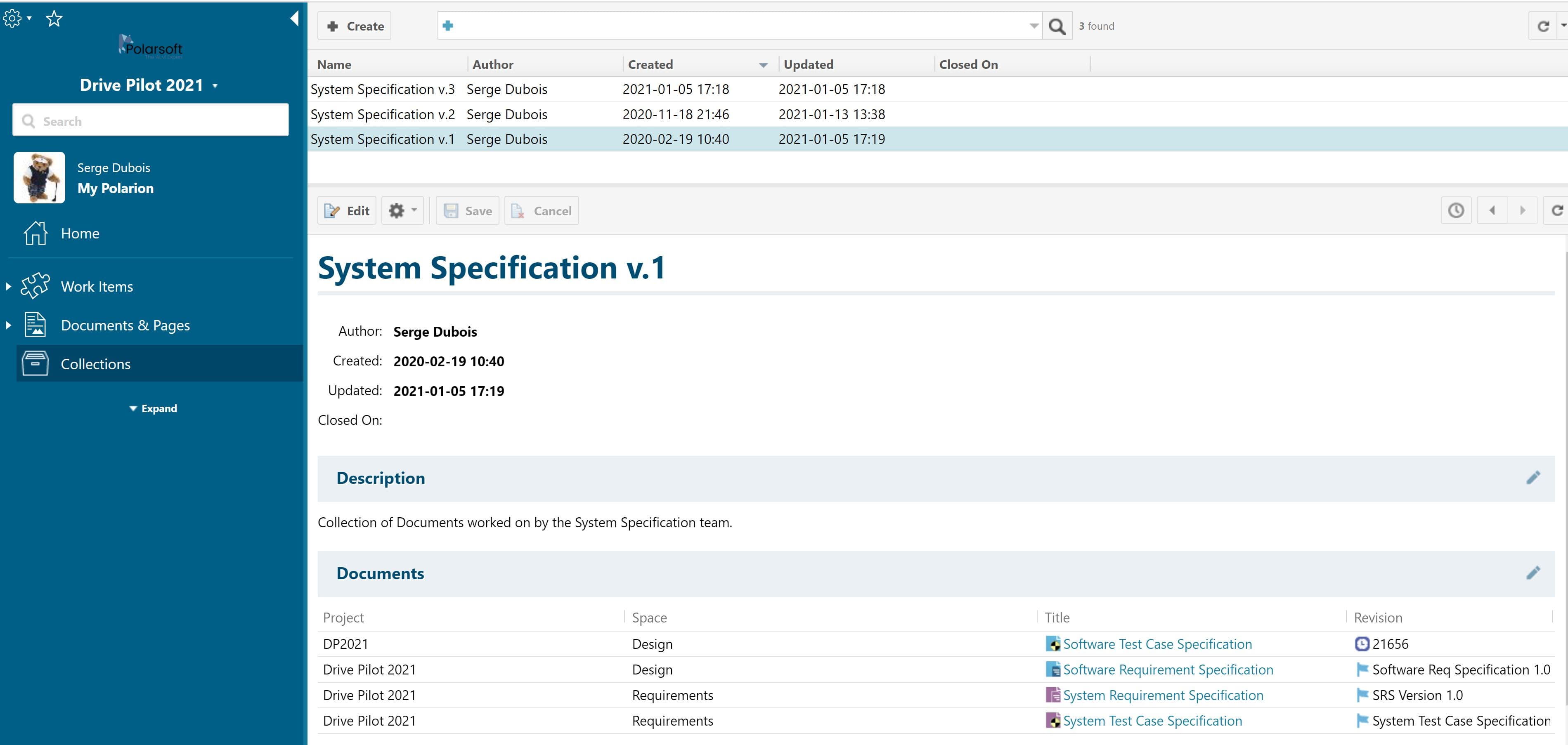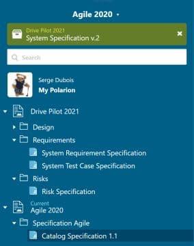 Puisque la fonctionnalité Collections est nouvelle, elle continue de s'enrichir de nouvelles possibilités. Vous pouvez ajouter et gérer des documents issus d'autres projets à vos Collections, ce qui est très pertinent si on considère un projet Polarion pour l'équipe Système, un projet Polarion pour l'équipe logicielle. Pour faciliter la navigation et la compréhension du périmètre de travail, la barre de navigation affiche le projet courant et le dossier qui contient le document. Ceci permet de suivre et comprendre aisément l’origine des documents.