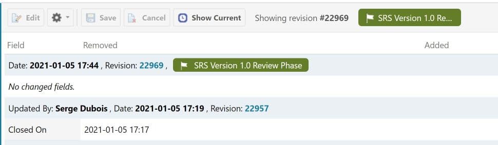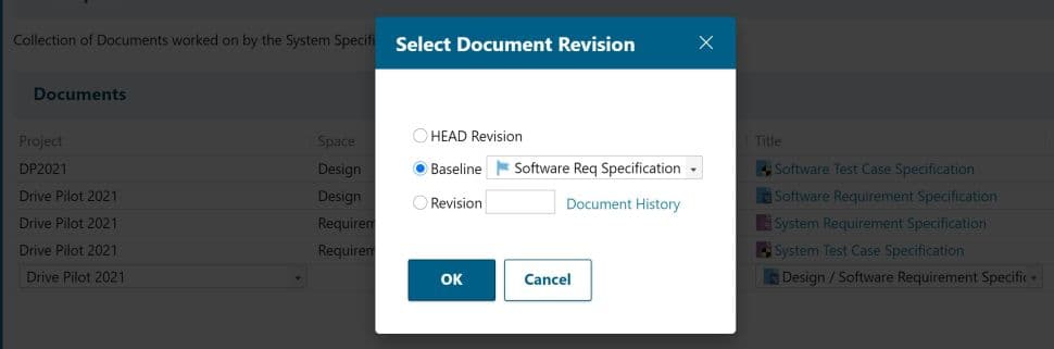 Les Collections viennent compléter et enrichir le principe de Baseline en permettant de représenter des configurations ou état du projet à un instant donné. En reprenant le concept d’une Baseline de Document, une Collection peut désormais être mise en Baseline. Le lien vers cette Baseline est proposé lorsque nous affichons la vue history de la Collection.