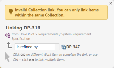 Lier des Work Items dans le contexte de la Collection Les actions possibles comme la création des liens entre Work Items sont également définies par le périmètre de la Collection. Une validation des liens s'effectue en temps réel lorsqu'un utilisateur veut relier par un lien de traçabilité un Work Item à un autre, par exemple une exigence système à une exigence logicielle. En d’autres termes, vous ne pouvez lier les Work Items entre eux que s'ils appartiennent à la même Collection, ce qui assure leur cohérence au sein même de la Collection.